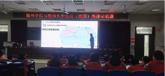 活动开始前,先由宿州市第九中学教务主任朱寿华介绍了出席本次活动的主要人员,明确了宿州学院与宿州市第九中学成功举办实习(地理)观摩示范课活动对于加强双方交流、新教师培养等方面的重要性。随后由宿州市第九中学地理教研组魏路路老师为大家上了一堂生动的“世界的人种”观摩示范课,魏老师从人种划分依据、三大人种的地理分布、种族平等和人种与地理环境四个方面进行讲解,课堂通过多媒体PPT课件、教材、讨论、活动、提问和习题等多种形式进行知识传授和教学。