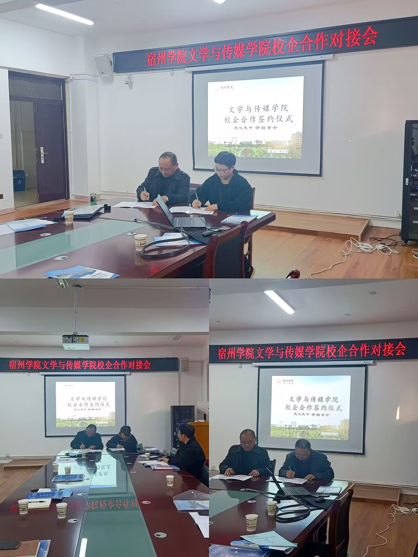 为进一步推动“4510”校地联合科创行动,加强供需对接,落实稳就业、保就业的决策部署,11月20日下午,文学与传媒学院在教学楼A303会议室召开“访企拓岗”校企合作对接会暨实习就业基地签约仪式,宿州居里传媒发展有限公司、砀山县才华小学、砀山县秋实学校三家单位来学院洽谈合作。党委书记王金岭,党委副书记、院长李月云,党委副书记、纪委书记刘影,副院长满建及毕业班辅导员参会,会议由党委书记王金岭主持。