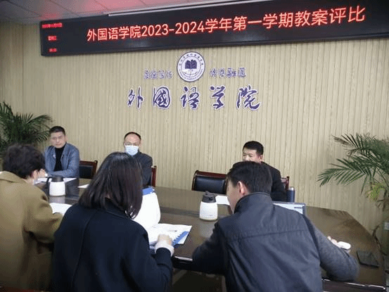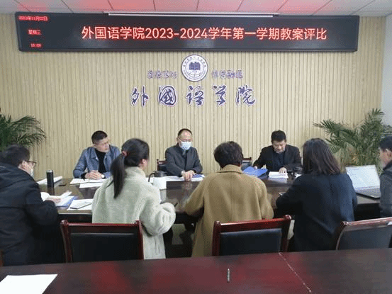 为贯彻学校《关于开展2023-2024学年第一学期“教师教学能力提升”活动的通知》要求,促进青年教师不断提高课堂教学水平和教学质量,外国语学院于11月22日下午在逸夫楼A318开展了2023-2024学年第一学期教案评比活动。此次活动由外国语学院副院长胡永近主持,学院教案评比活动领导小组成员担任评委。