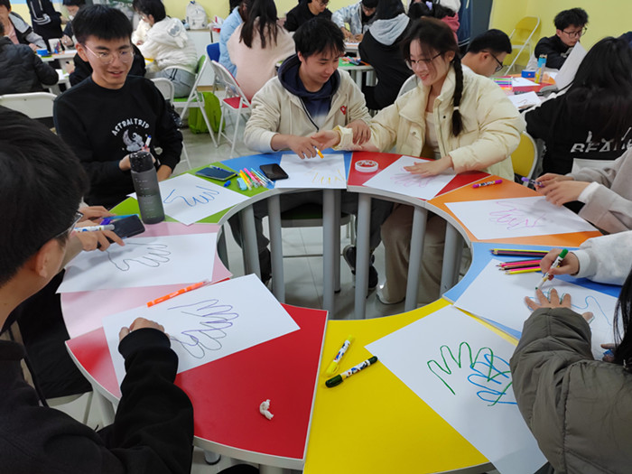 为了提升大学生心理健康素质,增强师范生心理职业素质,2023年11月24日下午,数学与统计学院在实训楼团体活动室举办了以“一画一世界,一笔一修行”为主题的绘画团体心理辅导活动,本次活动由心理辅导员刘静带领,22应数50名师范生参加。