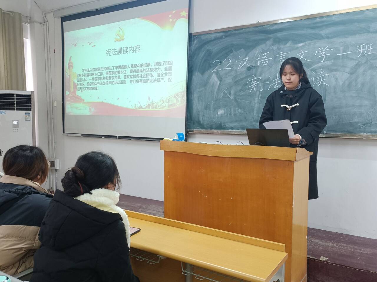 文学与传媒学院22汉语言文学2班在教学A313开展国家宪法日“宪法晨读”主题班会活动,活动由辅导员李雪玲老师主持。李雪玲老师带领同学们进行宪法宣读,讲解宪法条文,学习宪法知识,全班同学在老师的带领下集体向我国宪法进行了庄严的宣誓,声音嘹亮且虔诚,向我国的根本大法做出了最神圣的诺言,昂扬之气在每位同学心中油然而生。