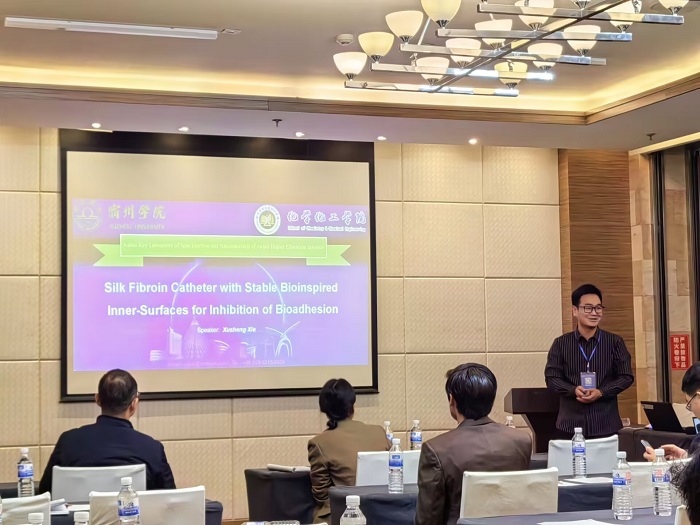 会议第二阶段,张克营教授和谢旭升博士分别做了题为《上转换纳米探针用于检测肿瘤标志物microRNA-21》《基于晶体调控的表面图案化丝蛋白材料构建及其长效抗污效果研究》的分会场报告。与会人员就相关问题进行了交流和讨论。