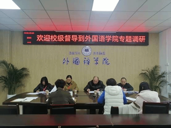 为落实学校质量文化建设三年行动计划,提升年轻教师的课堂教学能力,切实提高课堂教学质量,学校教学督导组成员于12月14日上午到外国语学院进行专项调研,参加此次调研活动的有校督导专家徐公伟、王华、周冲、李红,外国语学院院长张雁凌教授、教研室主任赵娟副教授、杨曼博士和教学秘书参与调研。