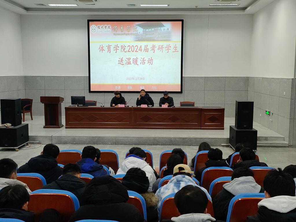 寒冬已至,备战已久的考研学子将迎来重要的笔试阶段。为帮助学生缓解考前压力,12月20日,体育学院开展“2024届考研学生送温暖”活动,为考研学生送上冬日里别样的温馨。院领导、20级辅导员和全体考研学生参加本次活动。