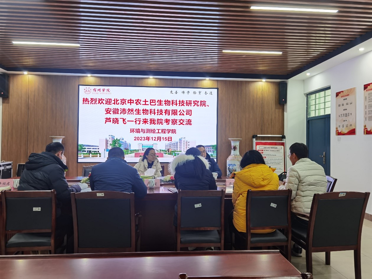 12月15日,北京中农土巴生物科技研究院有限公司、安徽沛然生物科技有限公司芦晓飞董事长、孟祥钦总经理等一行到宿州学院环境与测绘工程学院,就联合申报安徽省宿州市“揭榜挂帅”重大科技项目(“土壤生态与耕地可持续承载能力研究”)进行了专项沟通交流。会议由环测学院党委副书记、院长张海洋主持,地理与环境教研室主任刘娜博士,以及农业相关领域博士团队成员卢维宏、邱虎森、李福建、唐淑荣、裘浪等参加交流会。