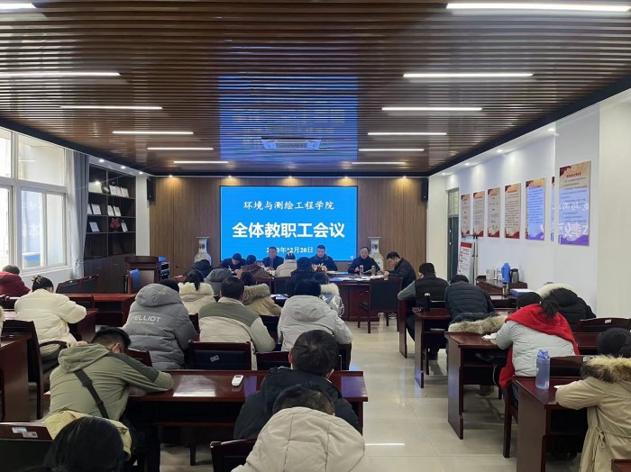 2023年12月20日下午,环测学院在工科楼A315召开全体教职工会议,学院党委书记胡冰,党委副书记、院长张海洋,党委副书记、纪委书记李建新,教学副院长徐国伟及全体教职工参加会议,会议由张海洋主持。