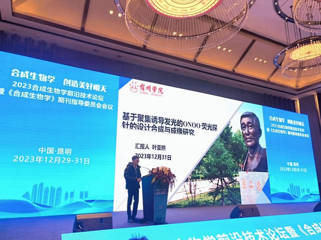 本次大会以“合成生物学创造美好明天”为主题,以努力打造成为合成生物学领域的权威学术和技术交流平台为宗旨,旨在推动合成生物学技术创新,突破生物制造菌种计算设计、高通量筛选、高效表达、精准调控等关键技术,有序推动在新药开发、疾病治疗、农业生产、物质合成、环境保护、能源供应和新材料开发等领域应用。本次大会邀请了杨胜利院士、赵国屏院士、元英进院士、郑裕国院士等9位在合成生物学领域取得杰出成绩的专家进行了大会报告。同时,本次会议设置了12个主题的分组报告,生工学院叶亚熙博士在“低碳与生物质资源生物转化”专场作了题为“基于聚集诱导发光的ONOO-荧光探针的设计合成与成像研究”的报告