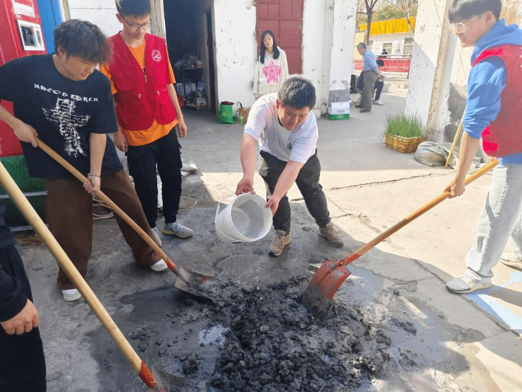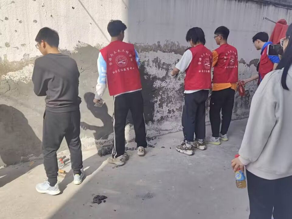 在活动开始志愿者们先将购买好的沙子,黏土,水等原料运到指定地点,然后在根据自己所学过的知识按照一定的比例来配比,最终将原料混合均匀形成粘性较高的水泥。在和水泥的同时,志愿者们手拿铲子和铁锹将先前墙上面的白皮给全部刮下来,以便后续的涂抹水泥,把白皮刮在地下后,志愿者们拿清洁工具将地面打扫干净保证社区的清洁。准备过程完成之后,志愿者们开始进行最为重要的一步,将水泥涂上墙,因为和完的水泥在涂墙的过程中可能会掉落在地上,而且还要保证厚度均匀确保每一片都是平整的以免涂完后凹凸不平。志愿者在重重困难下出色的完成了任务,并获得了社区居住人们的夸赞与赞美!