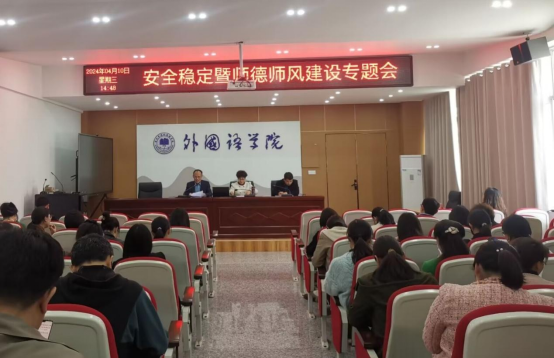 4月10日下午,外国语学院在逸夫楼一楼会议室召开了安全稳定暨师德师风建设专题会,院长张雁凌、副院长胡永近以及全体教职工参加了会议,会议由党委书记郝景东主持。