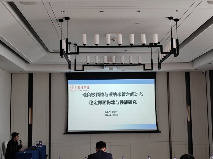 大会报告阶段,澳大利亚蒙纳士大学余艾冰院士、福州大学张久俊院士等专家学者做了主会场报告。宿州学院化学化工学院苏永祥博士做了题为《硅负极颗粒与碳纳米管之间动态稳定界面构建与性能研究》的报告。与会人员就相关问题进行了交流和讨论。
