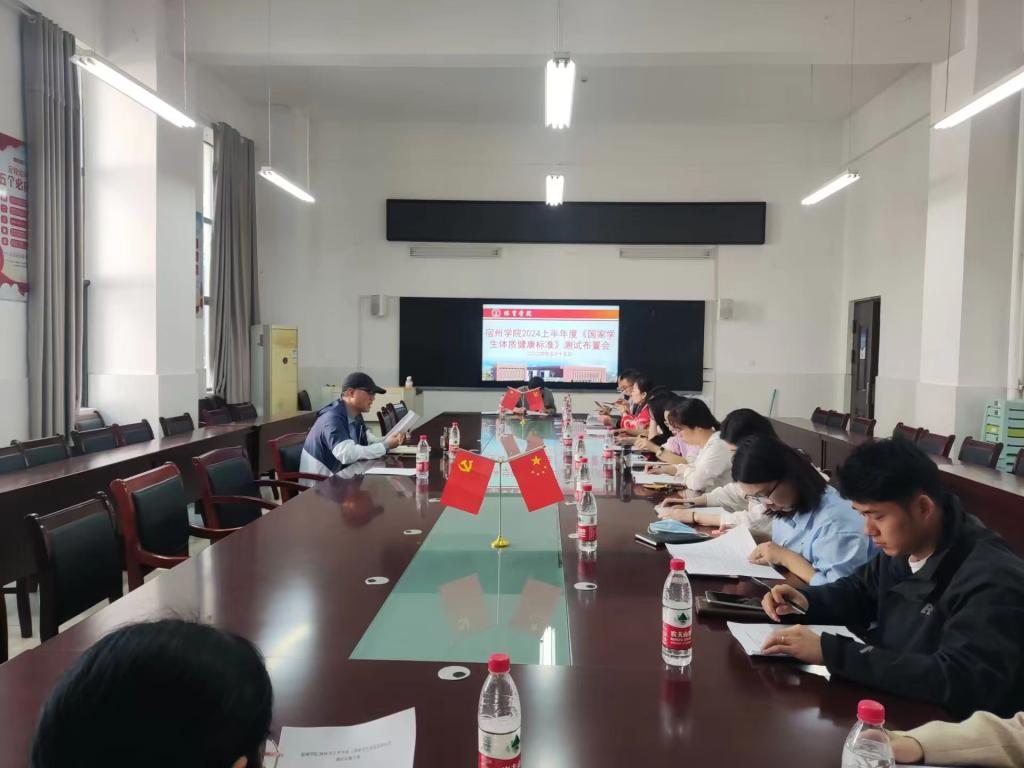 为进一步落实《国家学生体质健美标准》测试工作,确保安全、有序、高效完成上半年度学生体质健康测试工作,2024年5月15日上午,我院在在体育学院会议室召开测试工作安排部署会。宿州学院体育委员会办公室主任、体育学院院长白明,各二级学院党委副书记,体育学院负责体测工作的相关人员参加会议。