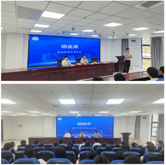 为激励在校学生学习优秀校友的成功经验,帮助同学们更好地明晰自己的学业规划和人生方向,5月24日下午,管理学院于实训楼C103举办五育大讲堂暨优秀校友返校交流活动。旅游管理专业优秀校友胡金涛和酒店管理专业优秀校友胡陆平应邀回访母校,学院相关专业学生参加本次交流活动,活动由学院专职组织员陈鹏主持。