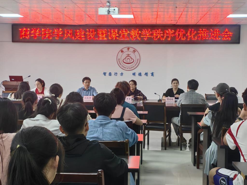 为进一步落实立德树人根本任务,践行“笃学 笃行 笃信”的优良学风,营造良好的学习氛围,促进学生全面成长,商学院于5月29日下午在实训楼B517召开学风建设暨课堂教学秩序优化推进会。教学副院长宁青青、教学秘书、分团委书记、全体辅导员、各班班长、学习委员、团支书参加会议,会议由院党委副书记、院长刘红军主持。