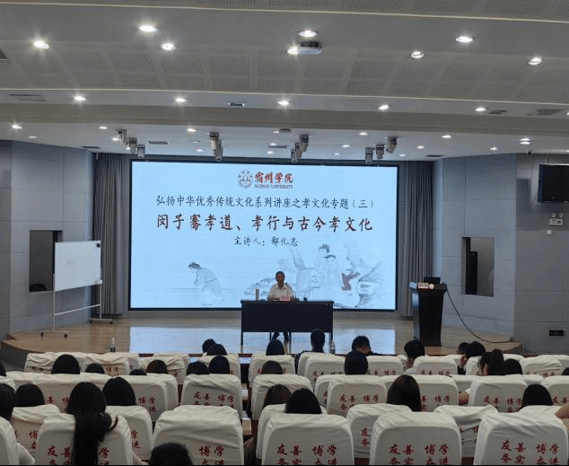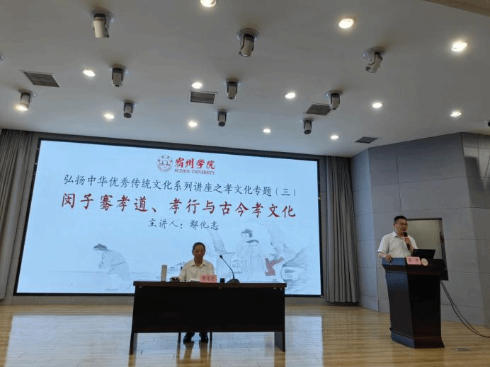 鄢化志教授在讲座开始前分享了安徽电视台对自己的访谈视频,视频通过“母在一子寒,母去三子单”的谚语,生动展现了闵子骞孝文化对中国民俗文化和思想道德的深远影响。接着,他从四个方面对闵子骞的孝道、孝行与古今孝文化进行了详细阐释:一是从明代张云汉《闵子世谱》和《四库全书总目提要》中举例论证闵子骞孝文化与宿州的关系;二是提出孝道和孝行是两个不同的文化层面,孝道更多地体现在上层建筑和意识形态层面,而孝行则更多地体现在基层事实和日常生活层面;闵子骞孝文化不仅包括上层建筑,还包括基层事实。三是从历史悠久的持续性和历史文化的丰富性来阐述孝文化的源远流长,并从天伦和人伦角度阐述孝文化的深层内涵;四是强调了弘扬孝文化的重要作用,孝文化是中华文化的重要组成部分,是中华民族传统美德的体现,弘扬孝文化有助于传承中华文化,增强民族自信。鄢化志最后指出无论发生多大变化,我们都要重视家庭建设,发扬中华民族传统家庭美德,促进家庭和睦,促进亲人相亲相爱,促进下一代健康成长,促进老年人老有所养。