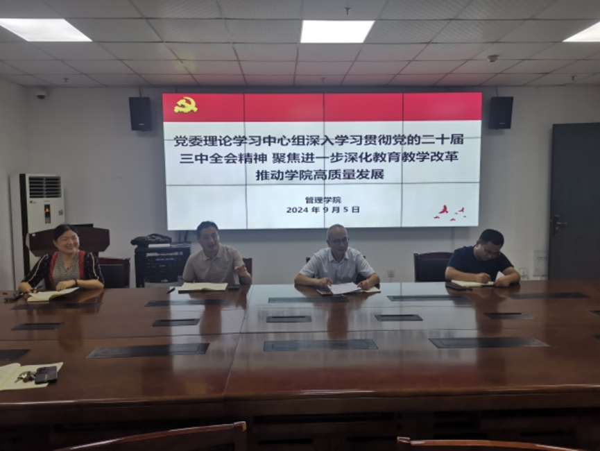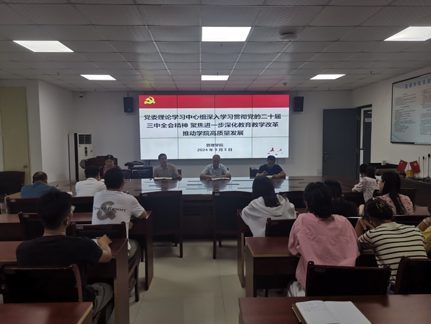 2024年9月5日,管理学院在实训楼C301召开党委理论学习中心组(扩大)学习研讨会,深入学习研讨党的二十届三中全会精神。院党委理论学习中心组成员、科级干部、党支部书记和教研室主任参加会议。会议由学院党委书记王北阳主持。
