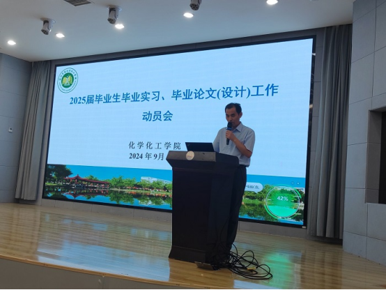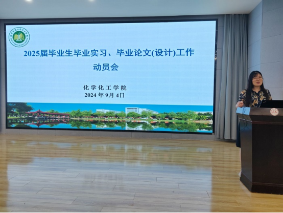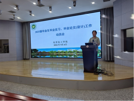 在学生动员会上,化学化工学院副院长王聪宣读了《化学化工学院2025届毕业生毕业实习工作方案》《化学化工学院2025届毕业论文(设计)工作方案》,并对毕业实习工作和毕业论文(设计)的具体安排进行了介绍,要求指导教师和学生严格按照学校和学院的要求,高质量完成毕业实习和毕业论文(设计)各项工作任务。随后,教研室主任谢永、毕业班辅导员代表朱程锋分别就毕业实习和毕业论文(设计)的注意事项及纪律要求进行详细说明。
