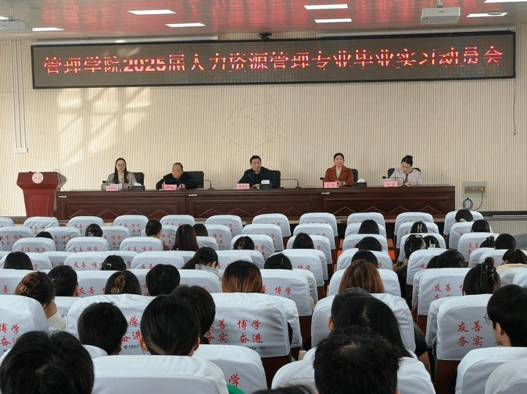 11月11日上午,管理学院在逸夫楼第二会议室召开2025届人力资源管理专业毕业实习动员会,管理学院党委副书记、院长韩传龙主持会议并讲话,副院长宋徽、人力资源管理教研室主任周冲、实习实训中心主任胡梦姚、学生事务科负责人徐蒙,实习指导教师、辅导员及2025届人力资源管理专业全体同学参加会议。