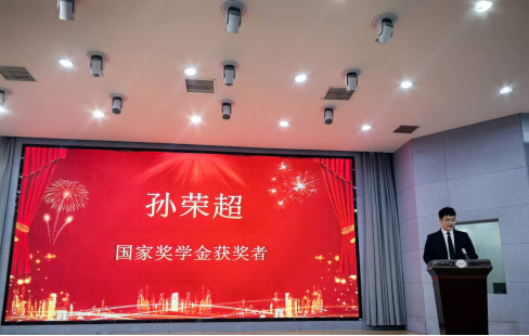 表彰环节结束后,优秀学生代表孙荣超上台发言。他分享了自己在学习过程中的宝贵经验,用亲身经历鼓励同学们要敢于追求梦想,不怕吃苦,珍惜大学时光,合理规划学习与生活,在不断提升自我的同时,积极为身边的同学和集体贡献力量。