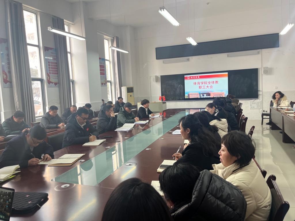 12月25日,体育学院在会议室A104召开全体教职工大会,学院党委书记李高,党委副书记、院长白明,党委副书记、纪委书记王德玉,副院长陈芳芳和全体教职工参加会议,会议由白明主持。