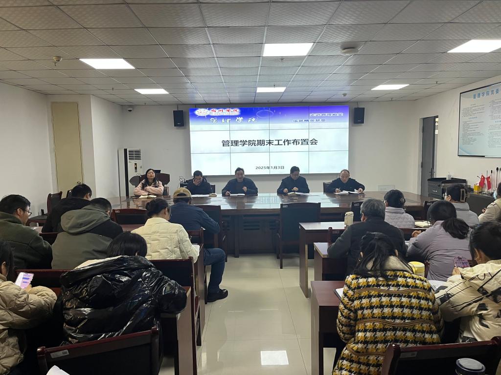 2025年1月3日,管理学院在教育园区实训楼C301召开期末工作布置会。院党委副书记、院长韩传龙,正处级组织员张持堂,院党委副书记、纪委书记张增林,副院长宋徽,副院长周冲及学院全体教师参加,会议由韩传龙主持。