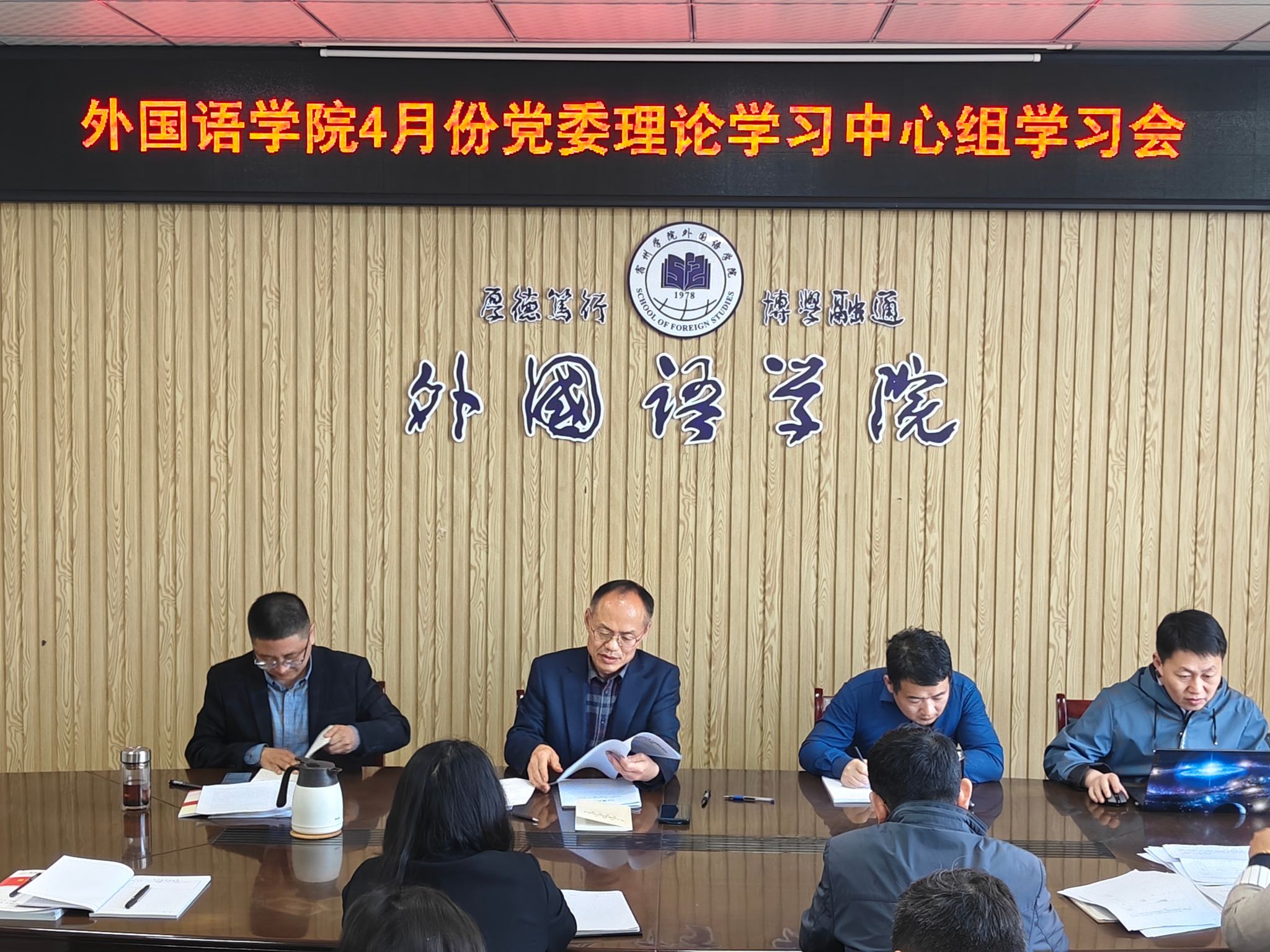 4月14日下午,外国语学院在逸夫楼A318会议室召开党委理论学习中心组学习会,学院党委委员和支部书记参加,会议由党委书记郝景东主持。