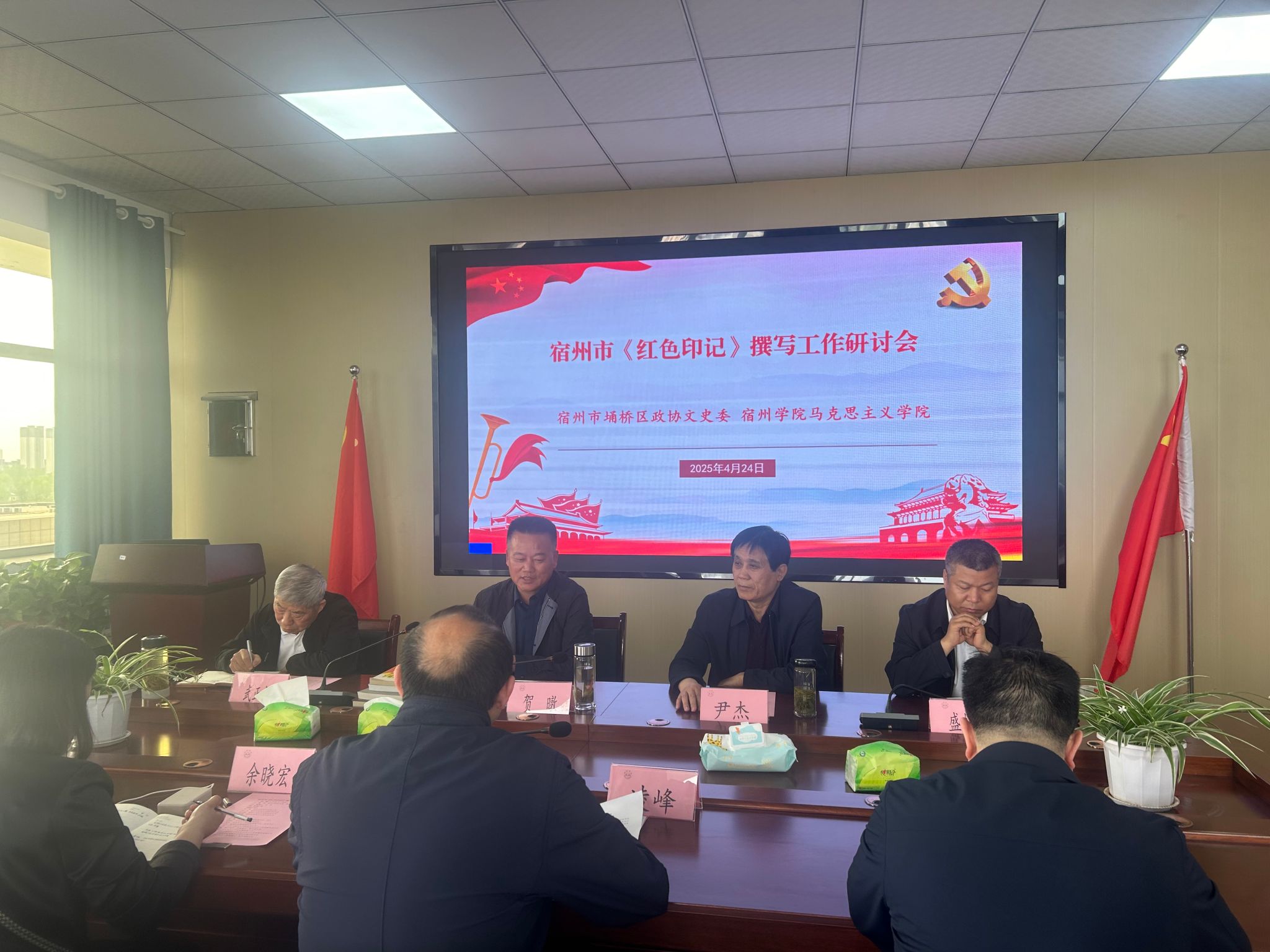 4月24日,宿州市《红色印记》撰写工作研讨会在马克思主义学院召开,埇桥区政协文史委主任贺暾及文史资料研究员尹杰、武正彪、盛怀峰等出席会议,马克思主义学院处科级干部、课程组负责人及部分教师代表出席会议,会议由马克思主义学院党委书记、院长凌峰主持。