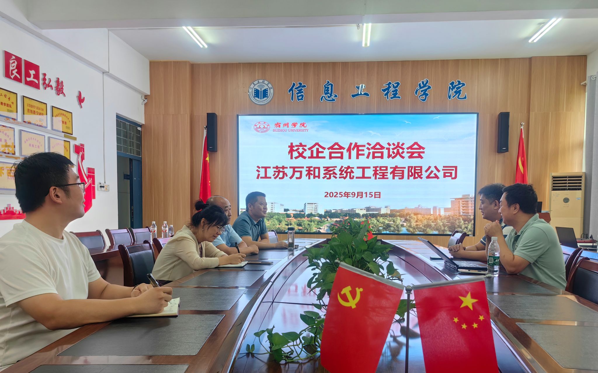 9月15日上午,信息工程学院与江苏万和系统工程有限公司召开校企合作洽谈会,江苏万和系统工程有限公司总经理苏正坤、朱庆,信息工程学院组织员(正处级)黄永刚,副院长潘正高、实习实训中心主任田文泉参加会议。会议由党委副书记、院长崔琳主持。