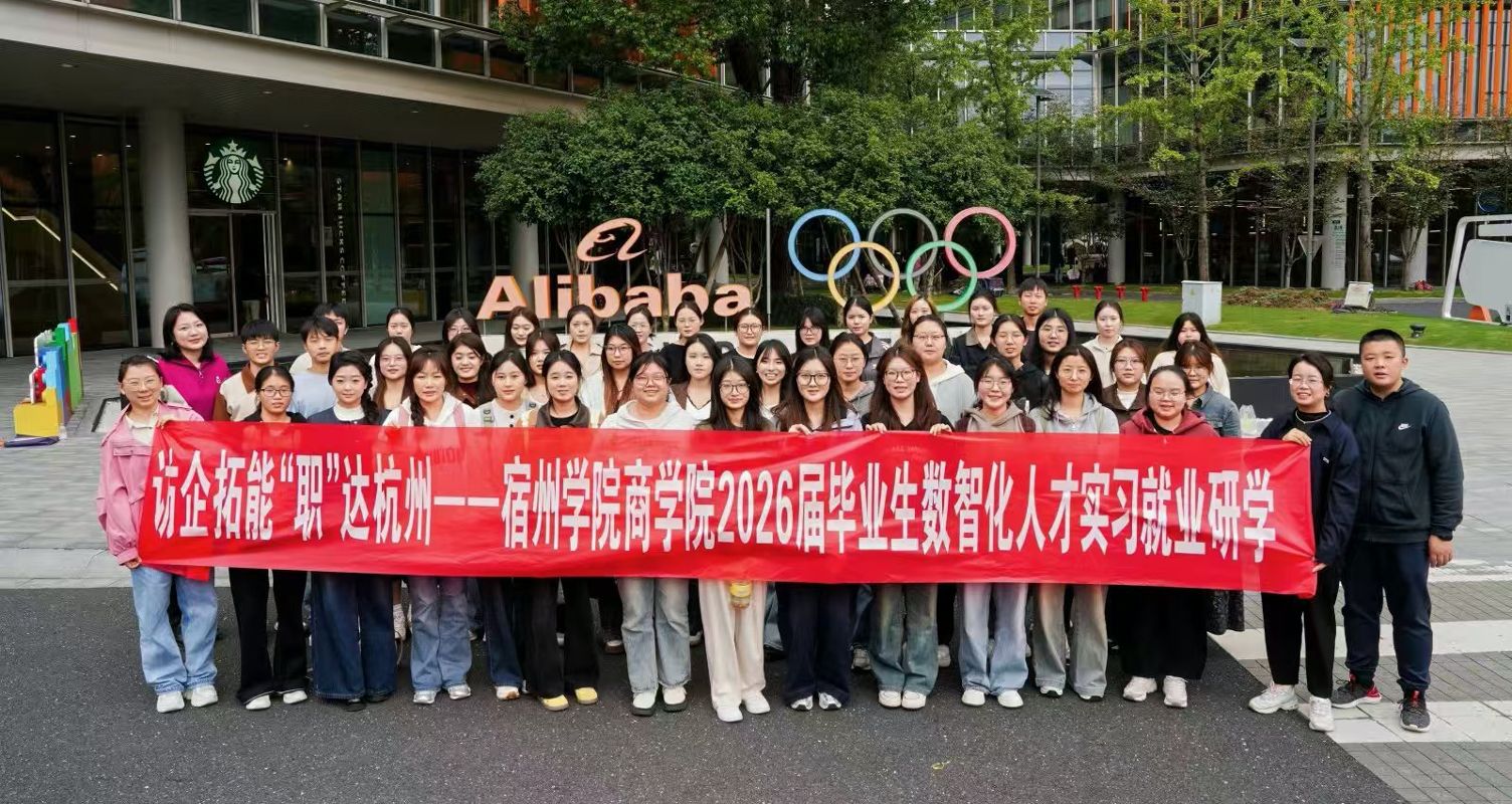 10月20日-24日,商学院组织2026届电子商务、国际经济与贸易、会计学、财务管理、物流工程等专业41名本科生,赴杭州市阿里巴巴数字生态创新园开展为期五天的数智化人才实习就业研学活动。学院副院长张冰秋带队,实习实训中心主任周宇和学生管理科科长孙茂顺参与管理。