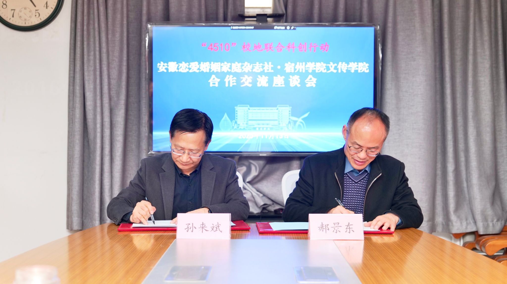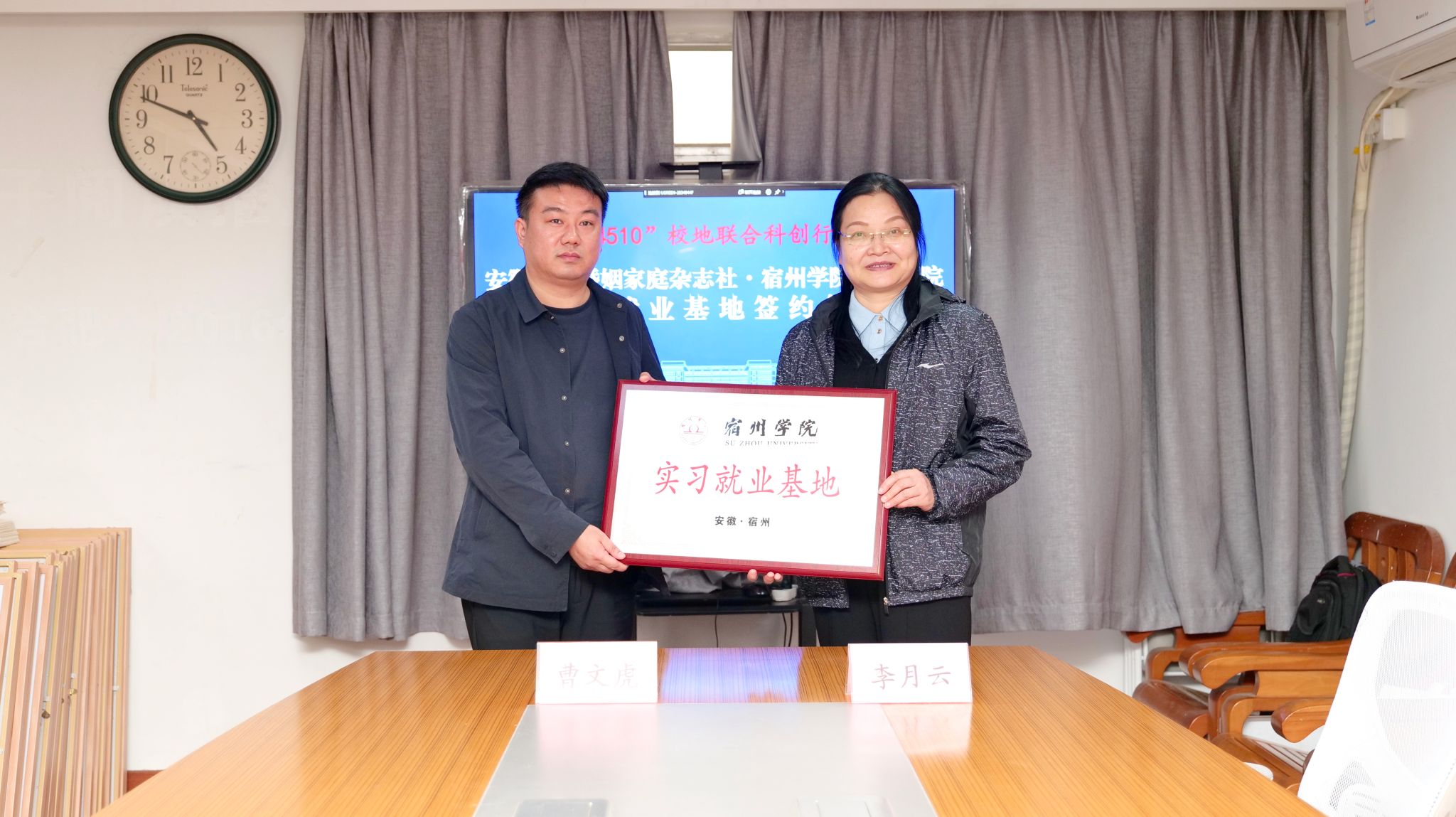 安徽省妇联宣传部一级调研员、恋爱婚姻家庭杂志社党支部书记孙来斌带领团队对郝景东一行表示热烈欢迎。孙来斌介绍了杂志社的发展状况、人才需求等,并对近年来我校为杂志社不断输送优秀人才表示感谢。郝景东介绍了学校基本情况和发展目标,李月云介绍了学院专业设置、人才培养特色、学生发展与就业意向等。双方就共同建立校企合作关系深入讨论并达成共识,签订合作协议,并举行了实习就业基地签约授牌仪式。