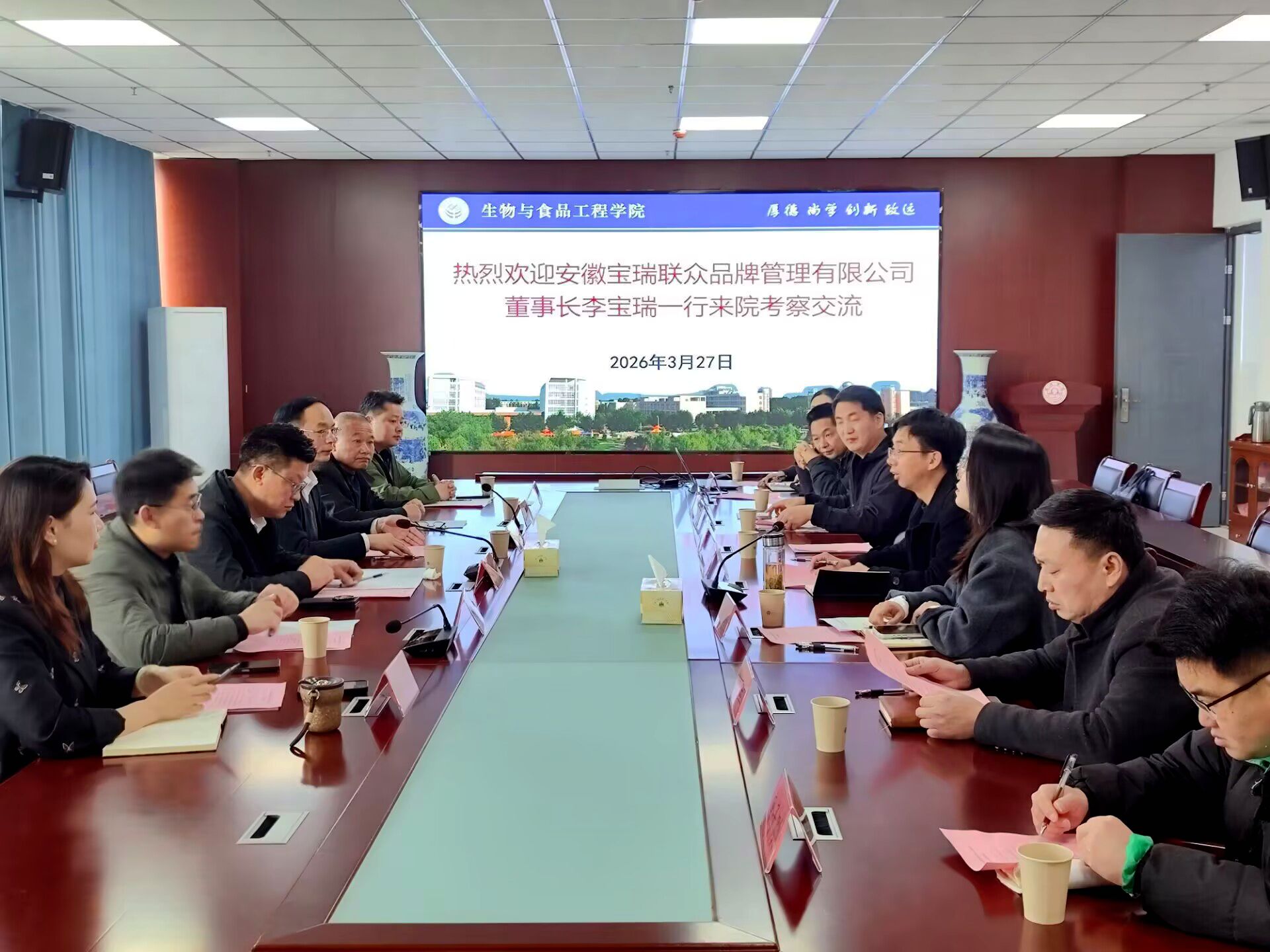 3月27日上午,安徽宝瑞联众品牌管理有限公司董事长李宝瑞率队到访宿州学院生物与食品工程学院考察交流。双方围绕技术联合攻关、人才协同培养、产学研平台共建等核心方向深入磋商并成功签订合作协议。