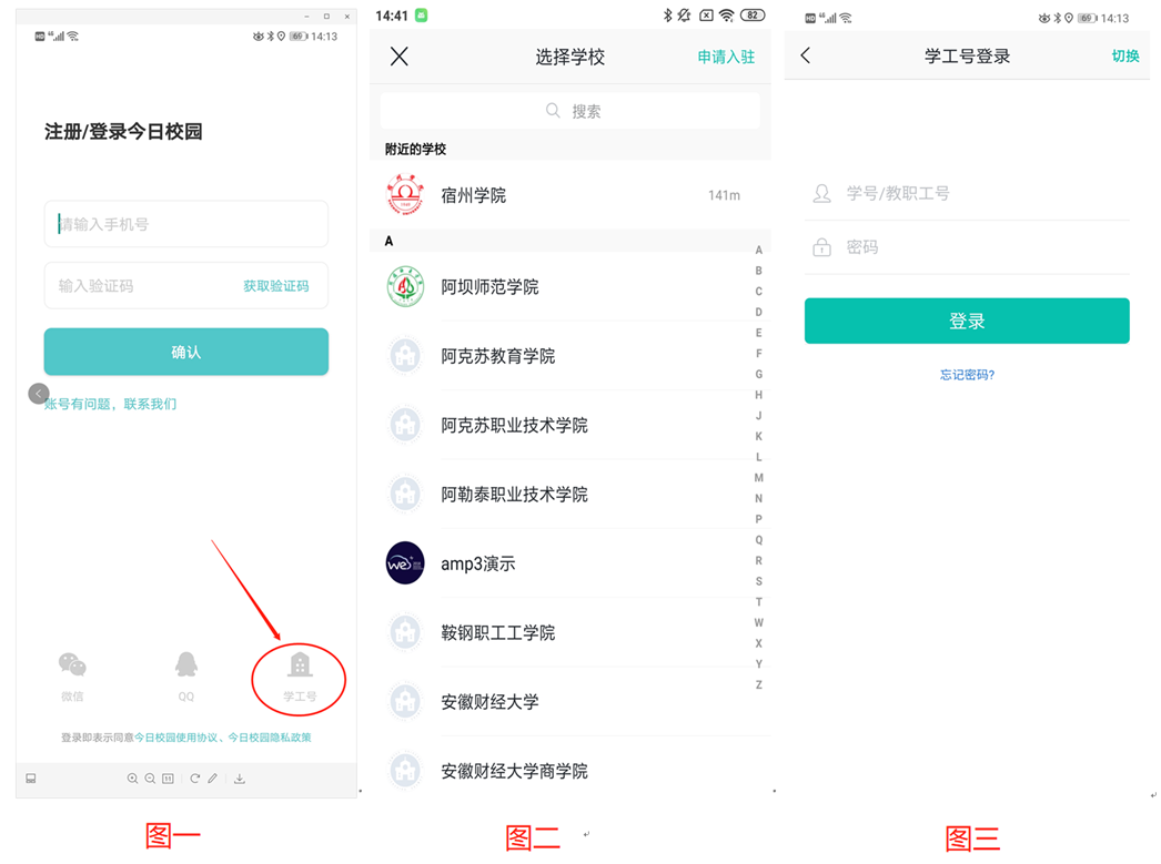 2.在APP登录界面选择右下角的“学工号”(图一),选择学校“宿州学院”(图二),输入学号或工号(图三),初始密码为6个1,登录后更改密码,绑定手机号,完成APP登录。