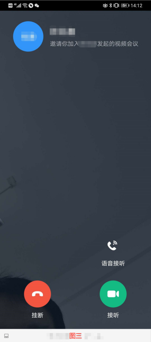 三、召开视频会议时,“钉钉”会收到视频会议邀请提示,点击接听即可加入视频会议,如图三。