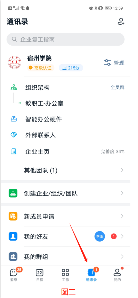 教职工手机号码已经提前导入钉钉的“宿州学院”组织机构,登录后会自动加入“宿州学院”组织机构。点击“通讯录”即可看到“宿州学院”组织架构页面,如图二所示。(如未能进入“宿州学院”组织机构,请与网络信息中心联系,余晓永13955771589)