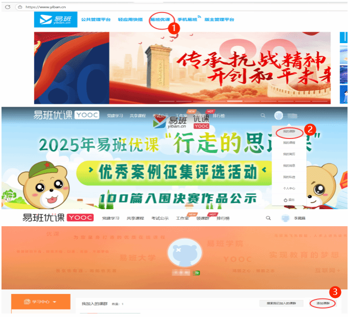 1.访问易班网网址:https://www.yiban.cn/;进入“易班优课”,注册登录后,在“我的课群-添加课群”中输入课群邀请码3LRAL96L加入2025级图书馆入馆教育课群。