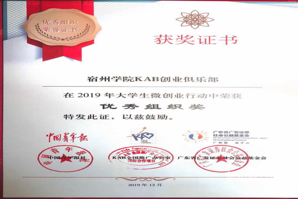 12月8日,由KAB全国推广办公室、广发证券社会公益基金会主办,广发证券股份有限公司、中国青年报社、广发乾和投资有限公司、广发证券投资者教育基地支持的2019年广发证券大学生微创业行动成果发布会暨大学生微创业论坛在北京举行。宿州学院KAB大学生创业俱乐部荣获2019年大学生微创业行动优秀组织奖。