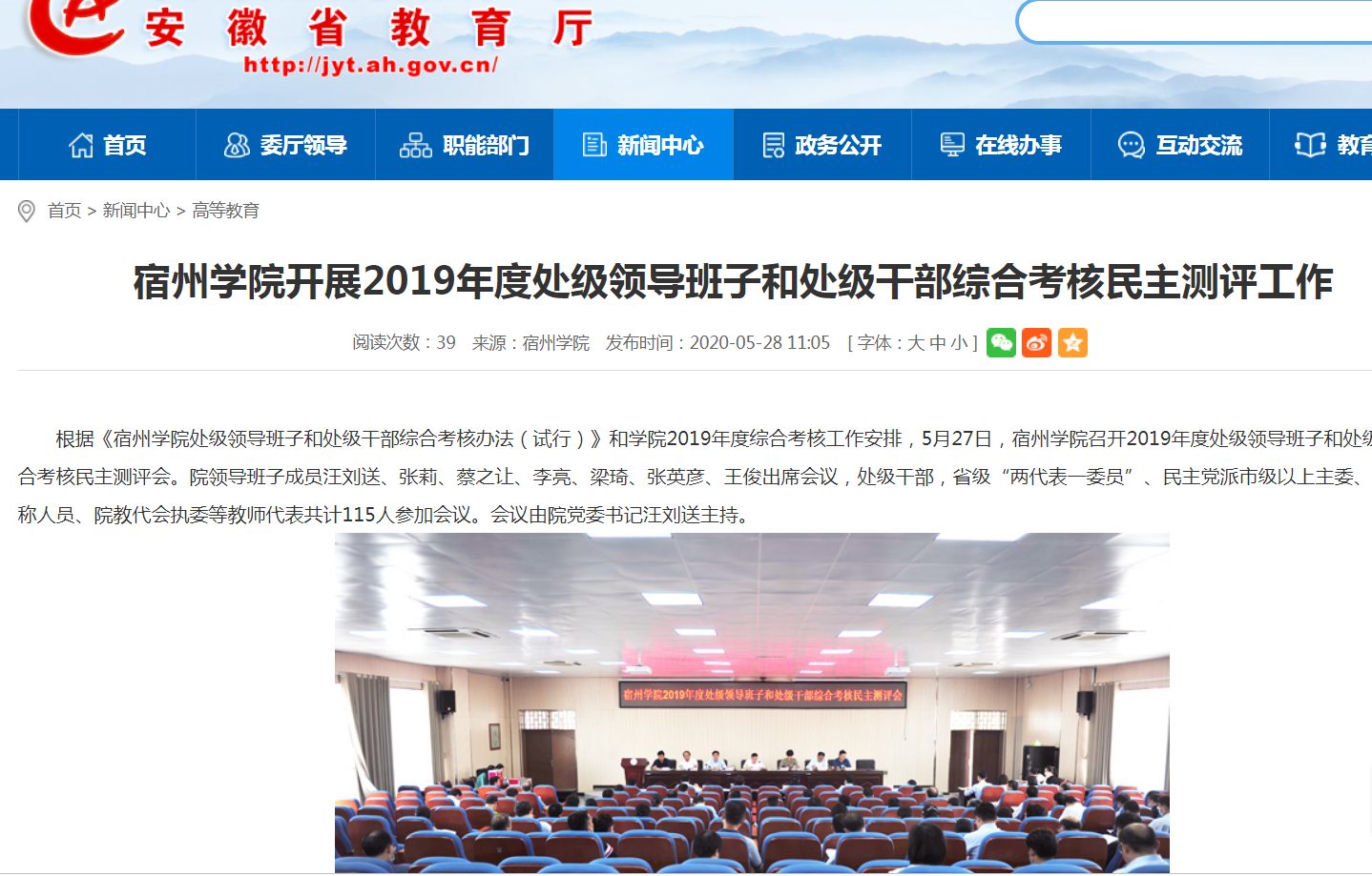 5月28日,《安徽教育网》以《宿州学院开展2019年度处级领导班子和处级干部综合考核民主测评工作》为题,对我校召开2019年度处级领导班子和处级干部综合考核民主测评会的消息进行了报道。