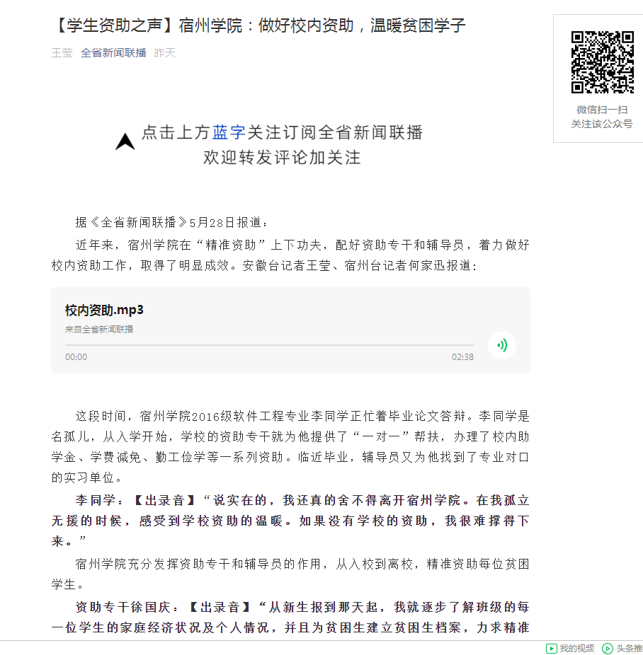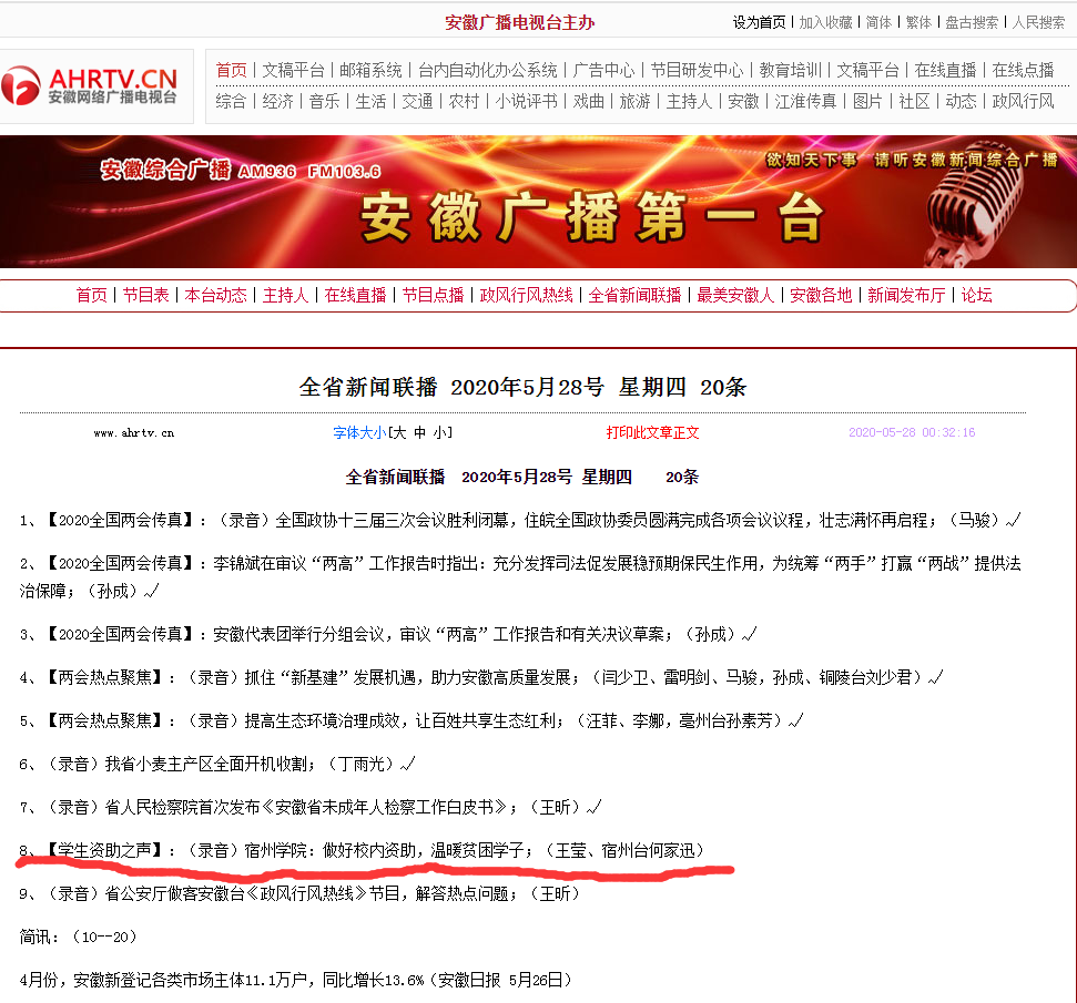 5月28日,《安徽新闻综合广播》(FM103.6/AM936)《全省新闻联播》栏目以《宿州学院:做好校内资助,温暖贫困学子》为题,对我校多措并举,认真做好学生资助工作的消息进行了报道。《全省新闻联播》是安徽广播电视台广播新闻节目的龙头,具有内容权威、时效性强、覆盖面广、影响力大等特点。