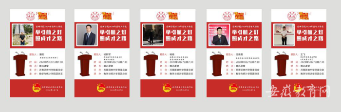 近日,宿州学院开展了以“举引航之灯,照成长之路”为主题的“青年大讲堂”活动。本次活动邀请到5位校友,包括相关教育集团创办人潘阳、杨树军,成都电子科技大学生物医学工程专业博士杨杨、安徽信息工程学院教务处科员任晨晨以及淮北市南坪镇人民政府公务员王飞。本次活动利用腾讯课堂平台,面向全院师生进行线上直播。