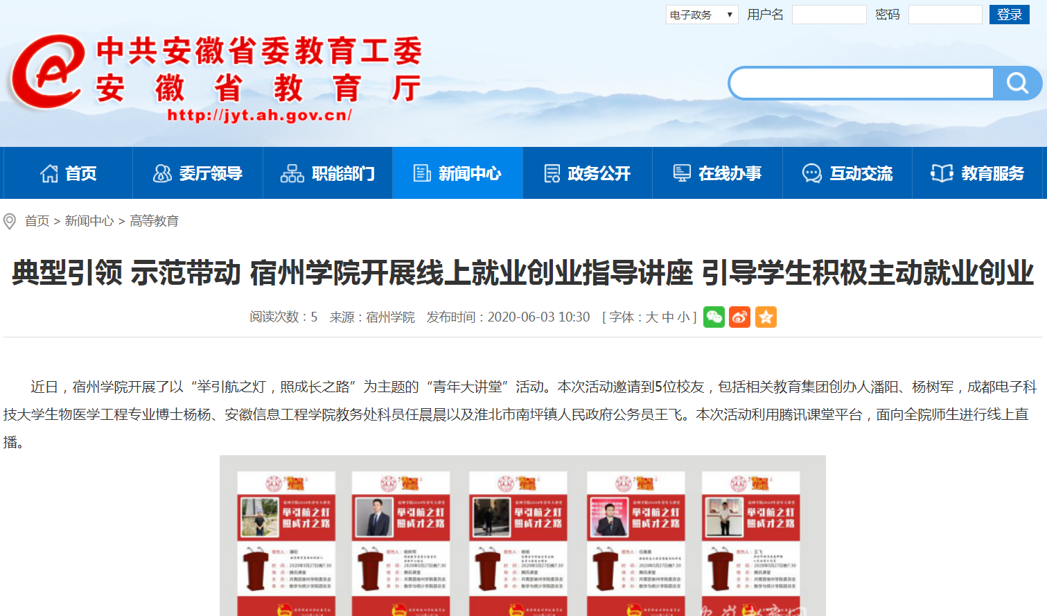 6月3日,《安徽教育网》以《典型引领 示范带动 宿州学院开展线上就业创业指导讲座 引导学生积极主动就业创业》为题,对我校开展以“举引航之灯,照成长之路”为主题的“青年大讲堂”活动的消息进行了报道。