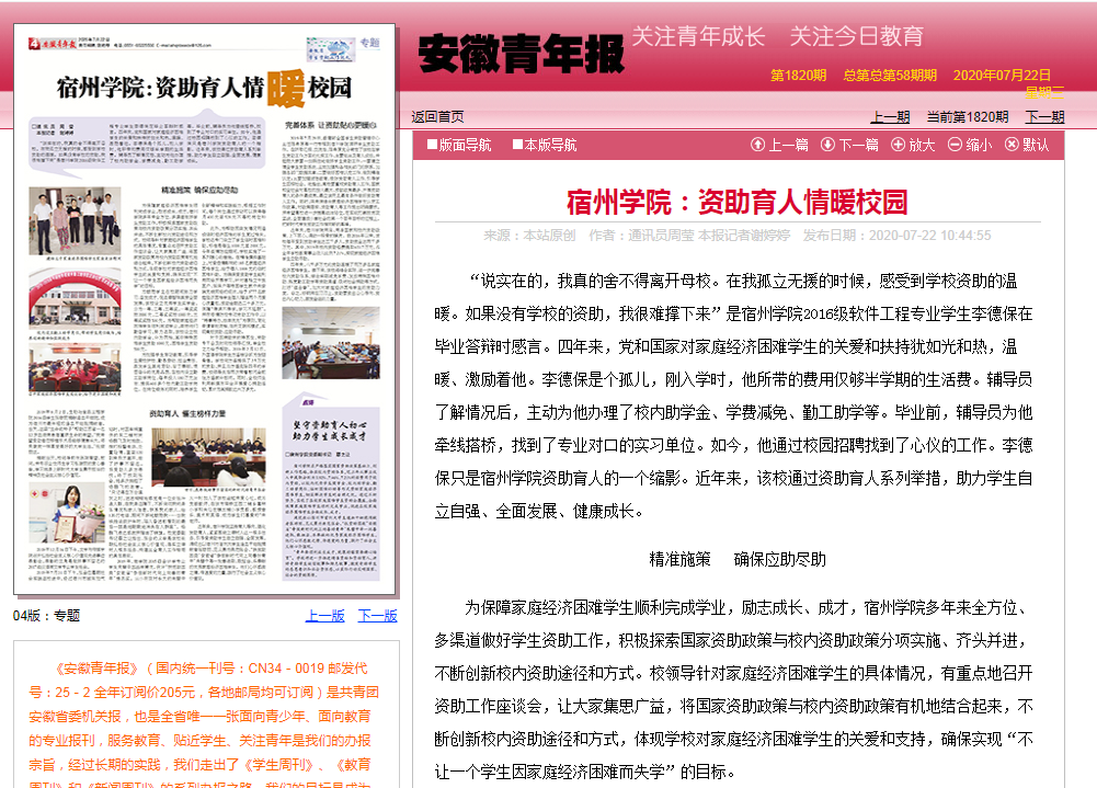 7月22日,《安徽青年报》以《宿州学院:资助育人情暖校园》为题,报道了我校近年来通过资助育人系列举措,助力学生自立自强、全面发展、健康成长的进行了报道。