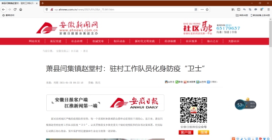 1月28日,《安徽新闻网》以《萧县闫集镇赵堂村:驻村工作队员化身防疫“卫士”》为题,对我院驻萧县闫集镇赵堂村工作队员化身防疫“卫士”的先进事迹进行了报道。
