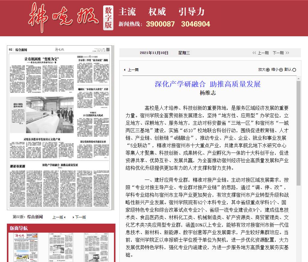 高校是人才培养、科技创新的重要阵地,是服务区域经济发展的重要力量。宿州学院全面贯彻新发展理念,坚持“地方性、应用型”办学定位,立足地方、深耕地方、服务地方,主动对标安徽省“三地一区”和宿州市“一城两区三基地”建设,实施“4510”校地联合科创行动,围绕促进教育链、人才链、产业链、创新链“4链融合”,推动专业、产业、企业、就业和事业发展“5业联动”,精准对接宿州市十大重点产业,共建共享皖北地下水研究中心等集人才聚集、科技创新、成果转化、产业孵化为一体的10大科创平台,促进资源共享、优势互补、发展共赢,为全面推动宿州经济社会高质量发展和产业结构优化升级提供更加有力的人才支撑和智力支持。