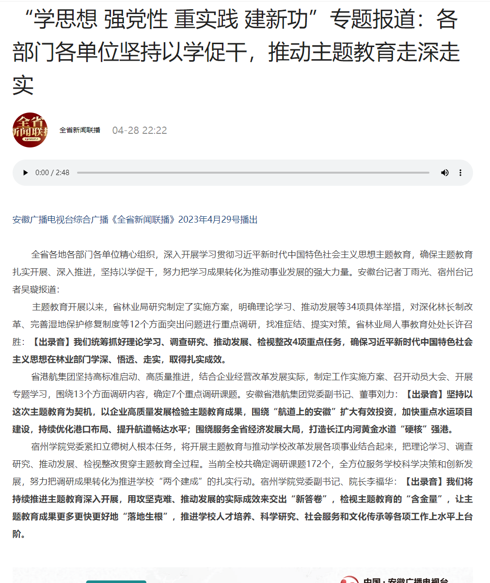 4月29日,安徽广播电视台综合广播《全省新闻联播》以《学思想 强党性 重实践 建新功”专题报道:各部门各单位坚持以学促干,推动主题教育走深走实》为题,报道了我校主题教育开展情况。