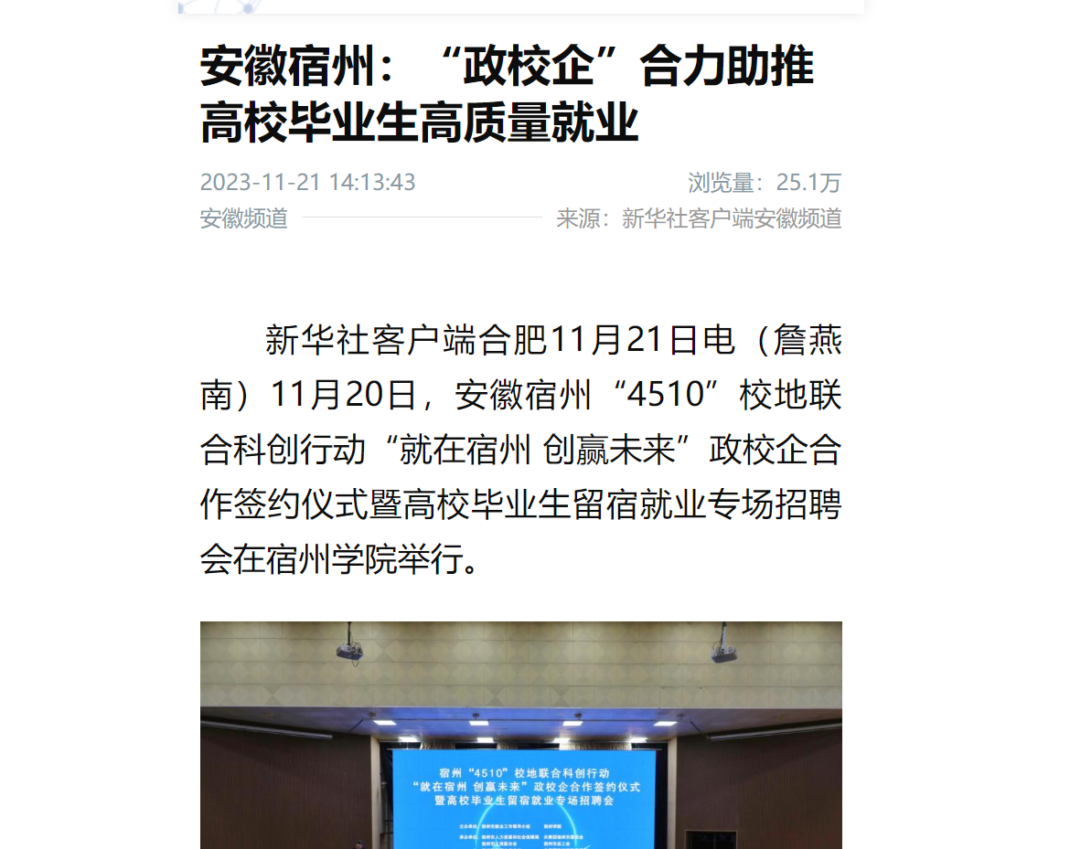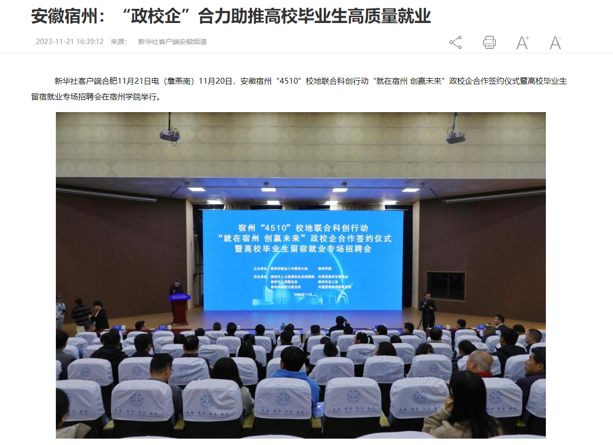 11月21日,新华社、新华社客户端以《安徽宿州:“政校企”合力助推高校毕业生高质量就业》为题,报道了由我院和宿州市就业工作领导小组联合主办的宿州“4510”校地联合科创行动“就在宿州 创赢未来”政校企合作签约仪式暨高校毕业生留宿就业专场招聘会的消息。