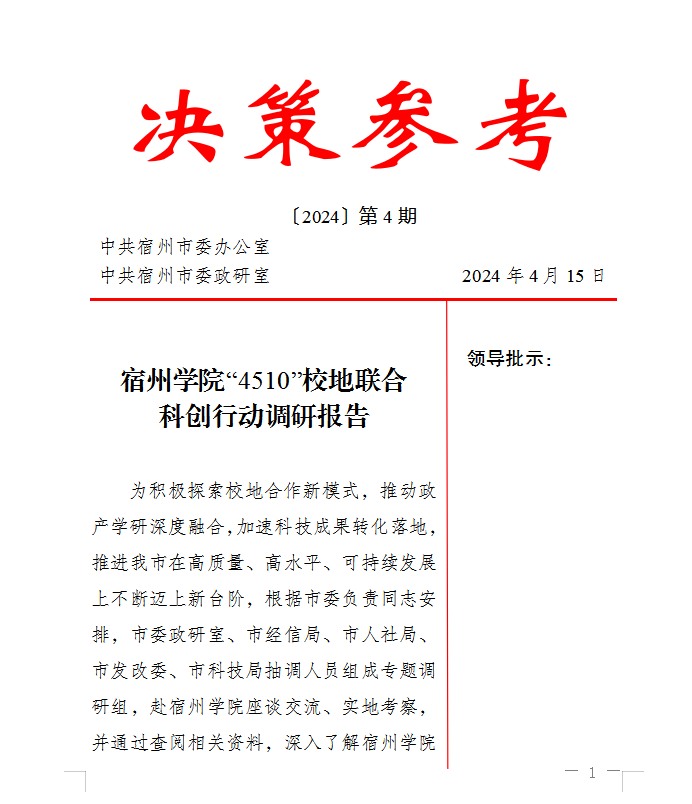 近日,市委办公室、市委政研室《决策参考》全文刊发《宿州学院“4510”校地联合科创行动调研报告》。