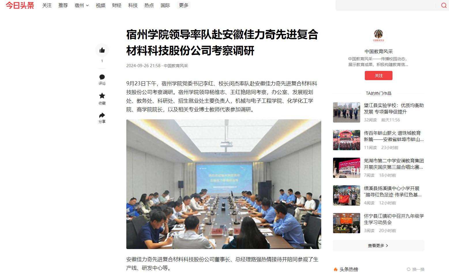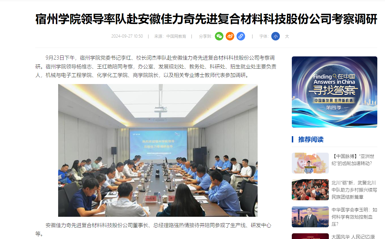 9月26日,《中国网》《今日头条》以《宿州学院领导率队赴安徽佳力奇先进复合材料科技股份公司考察调研》为题,报道了我校校领导率队赴安徽佳力奇先进复合材料科技股份公司考察调研的消息。