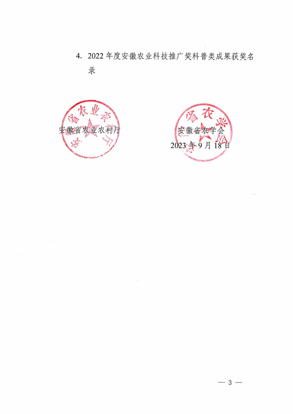 2023年9月18日,安徽省农业农村厅、安徽省农学会发布关于2022 年度安徽农业科技推广奖获奖情况,共评出一等奖6项、二等奖10项、三等奖16项、科普作品5项。由我校生物与食品工程学院王传之老师组织,联合宿州市金穗种业有限公司、宿州市埇桥区农业技术推广中心、安徽省农业技术推广总站共同完成的《优质抗逆“埇桥大豆”金豆 99 的选育与示范》成果荣获二等奖。该项成果也是本年度安徽农业科技推广奖唯一大豆获奖项目。