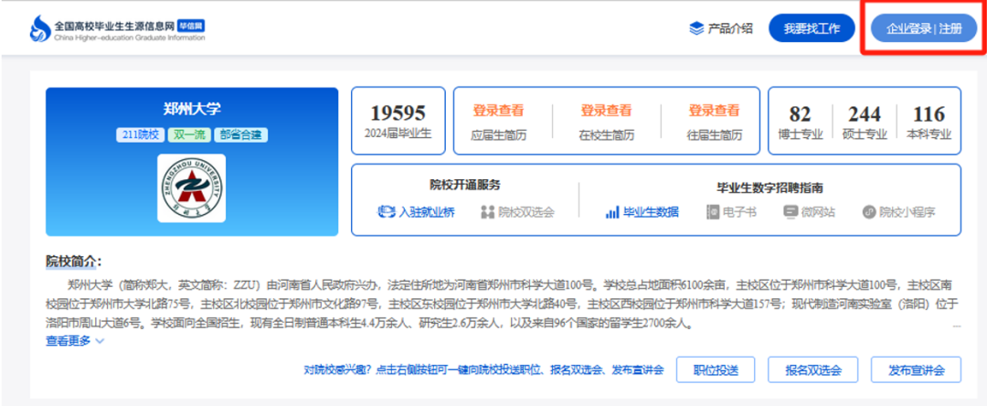 1、登录宿州学院专属毕业生生源信息网:https://www.chgi.cn/ahszu?=chgi 点击右上角【企业登录|注册】(建议使用火狐浏览器或谷歌浏览器电脑端登录)