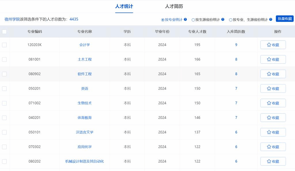 宿州学院毕业生生源信息网现已聚合全校的生源数据,囊括了往届生、应届生、在校生的生源信息,依据地域、专业、生源地等多维度展现,为用人单位提供专属的生源信息检索工具!