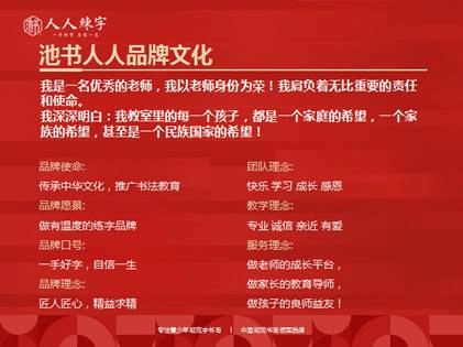 公司有专业的团队培养机制(五大培养计划)、有完整的品牌文化建设方案(十三大品牌优势)、有健全的生态服务系统(十大生态系统)、有自己的公益组织(人人公益事业部),覆盖教研、师训、教学、考级、赛事、研学、家庭教育、学业规划、延展课程方向,以爱为核心,以传承中华文化、推广书法教育”为使命,以“做有温度的练字品牌、中国规范书写领军品牌”为目标,以“合作联营、旗舰校区、品牌加盟”为模式,以“育老师、育课程、育学生、育家长”为理念,开展书法推广教育事业。